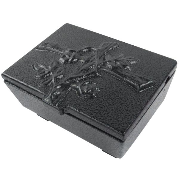 Schwarzer rechteckiger Weihwasserkessel mit Deckel und verschraubbarem Boden. Befestigung nicht enthalten. Mit Aussparung für Weihwasserpinsel und Befestigungsbohrung.