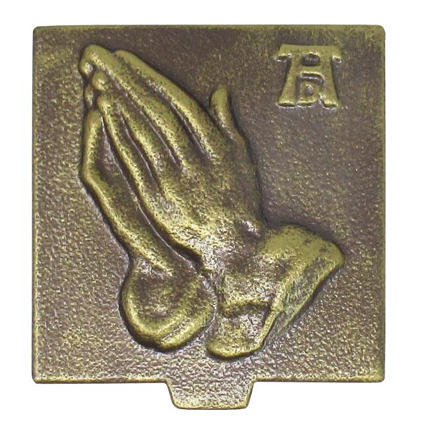 Stahl Weihwasserbecken betende Hände bronzefarben. Weihwasserkessel mit verschraubbarem Boden. Befestigung nicht enthalten. Mit Aussparung für Weihwasserpinsel und Befestigungsbohrung.