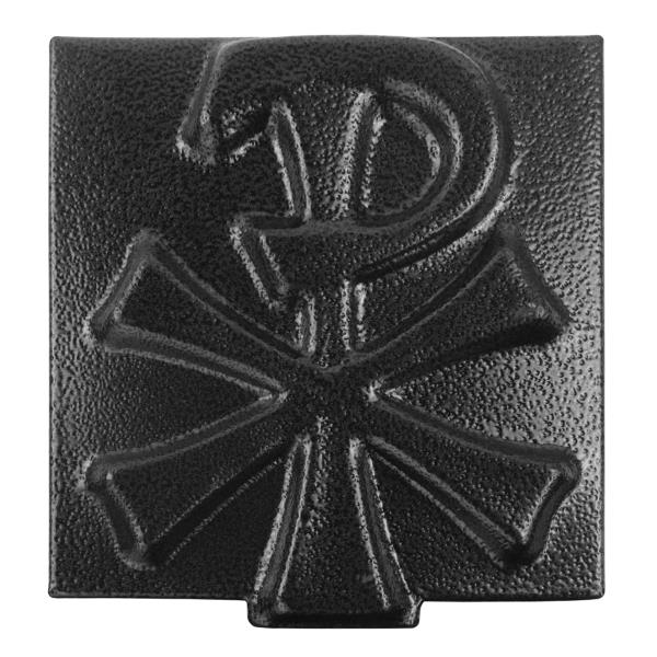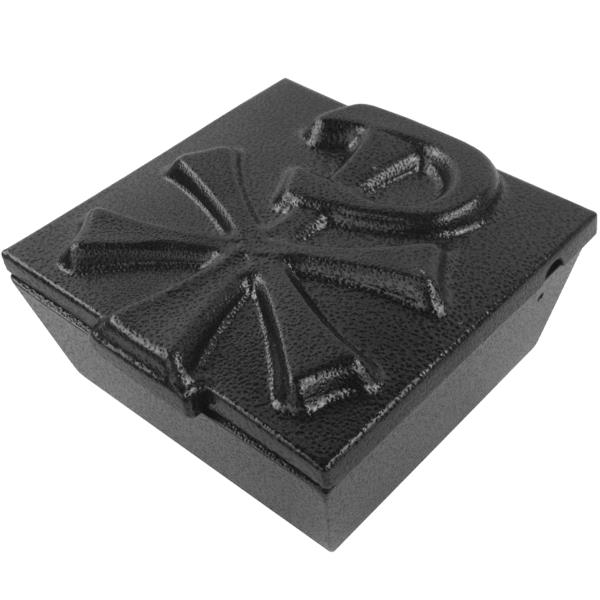Weihwasserbecken Stahl schwarz. Zeichen Pax auf Deckel. Mit Aussparung für Weihwasserpinsel und Befestigungsbohrung.
