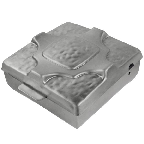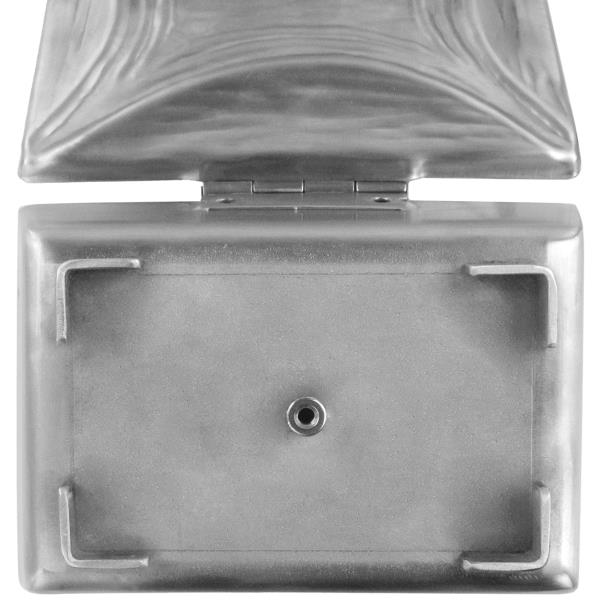 Weihwasserbehälter Edelstahl. Weihwasserschale mit Deckel, Aussparung für Weihwasserpinsel und Befestigungsbohrung.