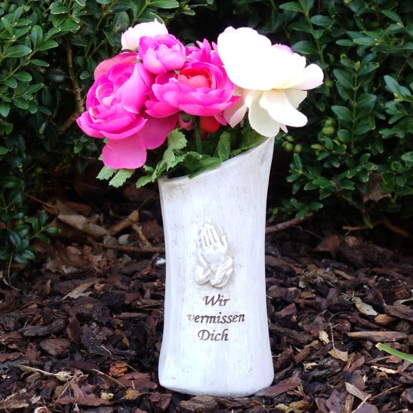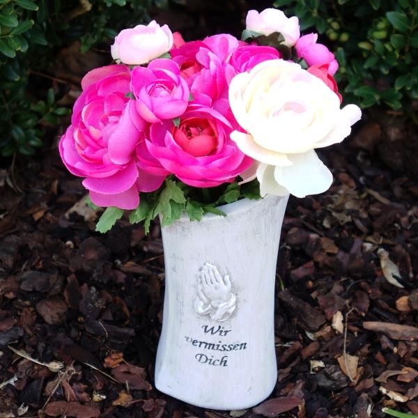 Grabvase Inschrift mit künstlichen Ranunkeln als Seidenblumen. Fertiger Grabschmuck zum Gedenken mit betenden Händen und Inschrift Wir vermissen Dich.