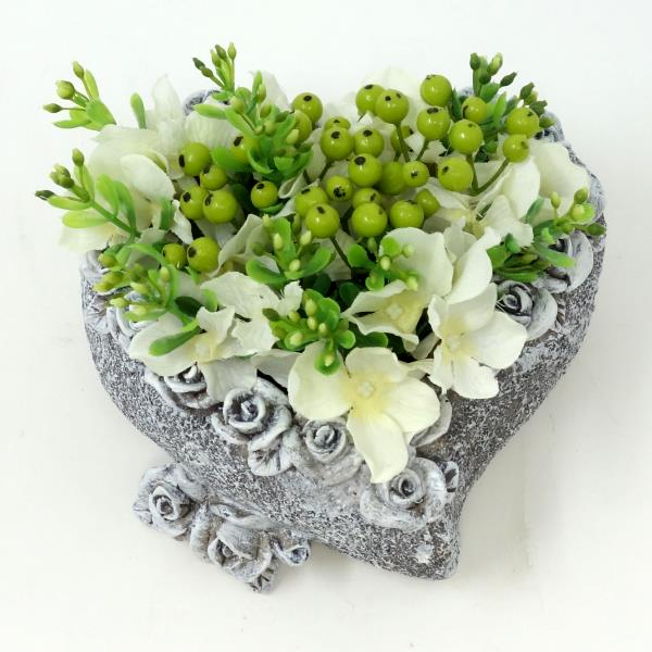 Grabgesteck Herz mit Rosen und Hortensien verziert. Haltbare Kunstblumen für einen dauerhaften Grabschmuck.
