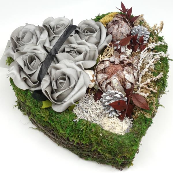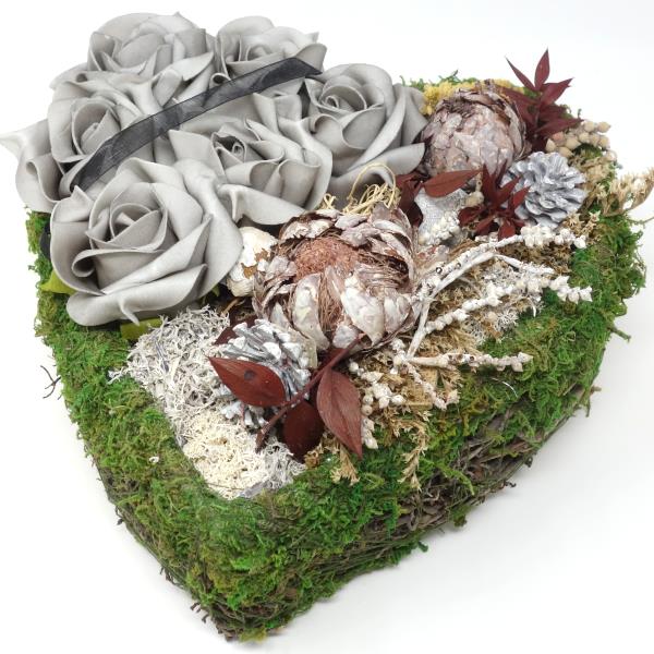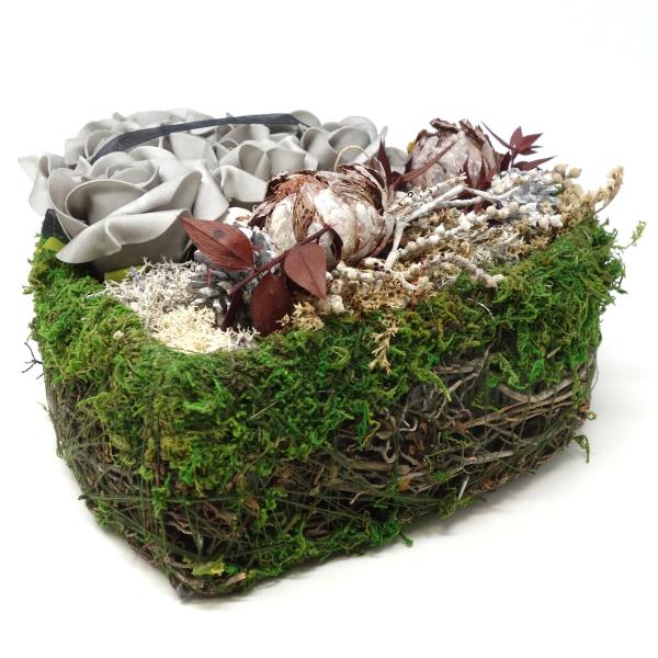 Grabherz handgefertigt mit Exoten und Rosen. Herz aus Naturzweigen und Moos. Liebevoll handgefertigtes Herz Grabgesteck als persönliches Einzelstück.