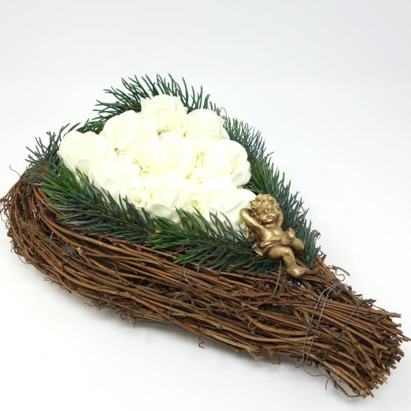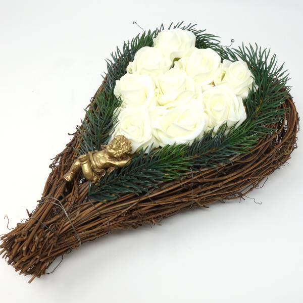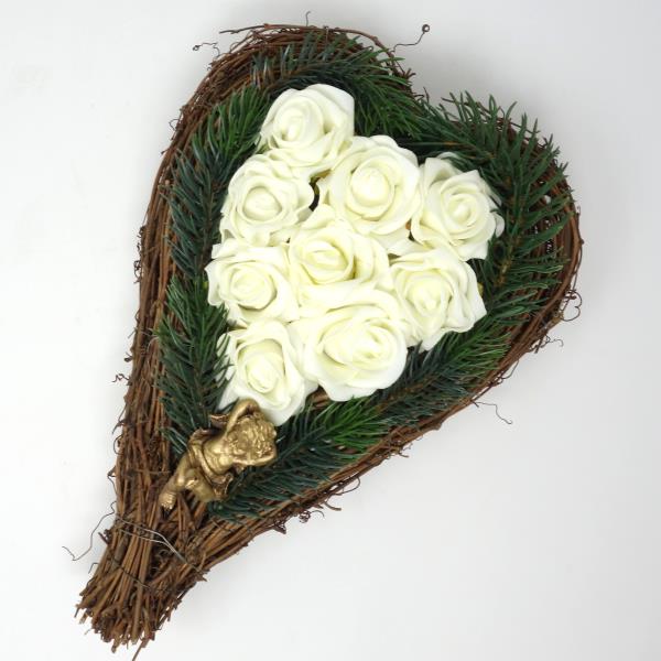 Grabschmuck mit goldfarbenen Engelchen, Foam Rosen und mit Tanne umrahmt. Trauertage Herzgesteck mit Rosenblüten und kleiner Engelfigur. Liebevoll handgefertigt als Einzelstück.