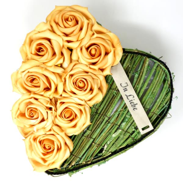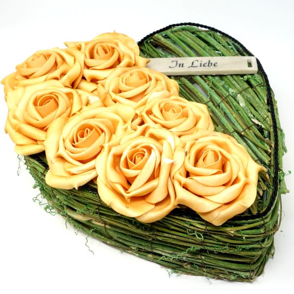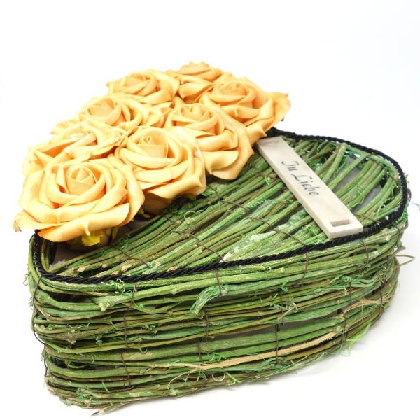 Großes Grabherz handgefertigt mit Kunstrosenblüten. Herz aus grünen Naturzweigen. Liebevoll handgefertigtes Trauerherz als persönliches Einzelstück.