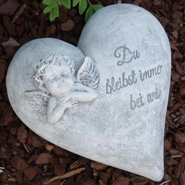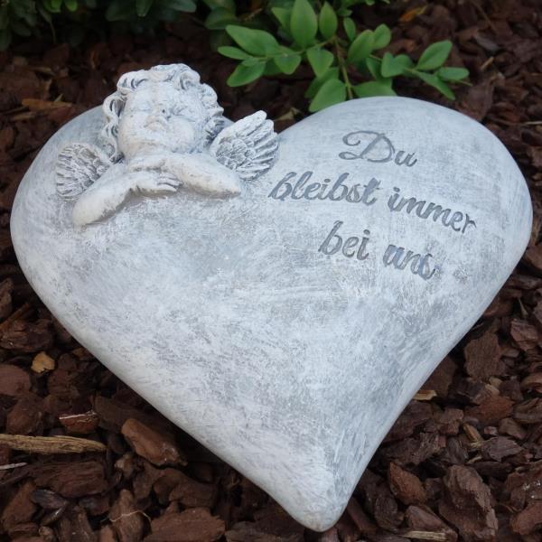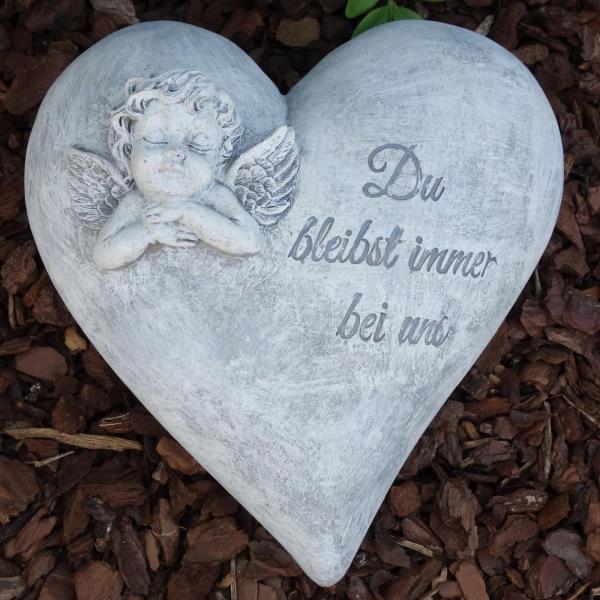 Deko Herz mit Engelsbüste und Gravur Inschrift Du bleibst immer bei uns. Grabschmuck Grabherz zum Gedenken.