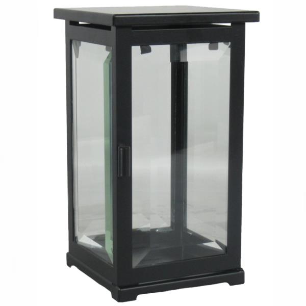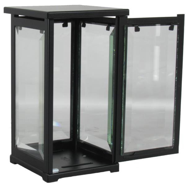 Stahl Grablaterne schwarz mit Tür und Facettenscheiben. Nur für den Außenbereich geeignet. Maximal 3 Tage Brenner mit Schutzhülle.