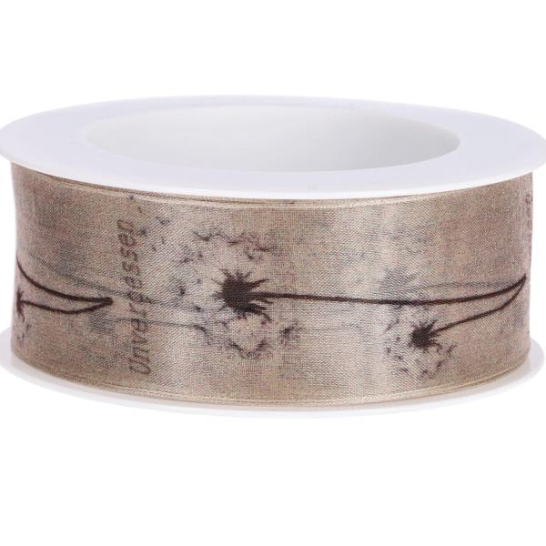 Trauerband Unvergessen mit Pusteblumen verziert und Drahtkante.
