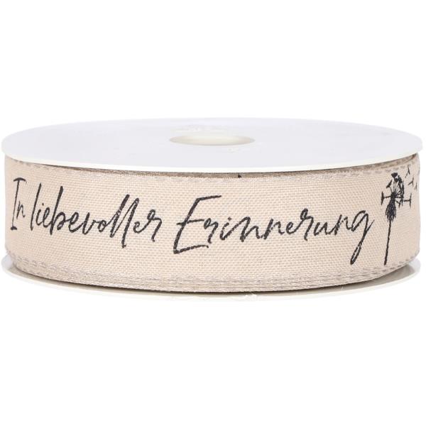 Dekoband In liebevoller Erinnerung. Trauerband stilvoll für alle Traueranlässe. Bestens geeignet für die florale Gestaltung mit der besonderen Note für Arrangements. Farbe: Natur.