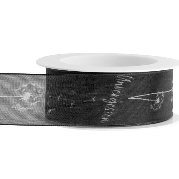 Trauerband Unvergessen mit Pusteblumen verziert und Drahtkante.